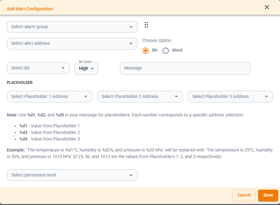 Set Alarma for any critical parameter, with granular permission levels (0–100) to control access.